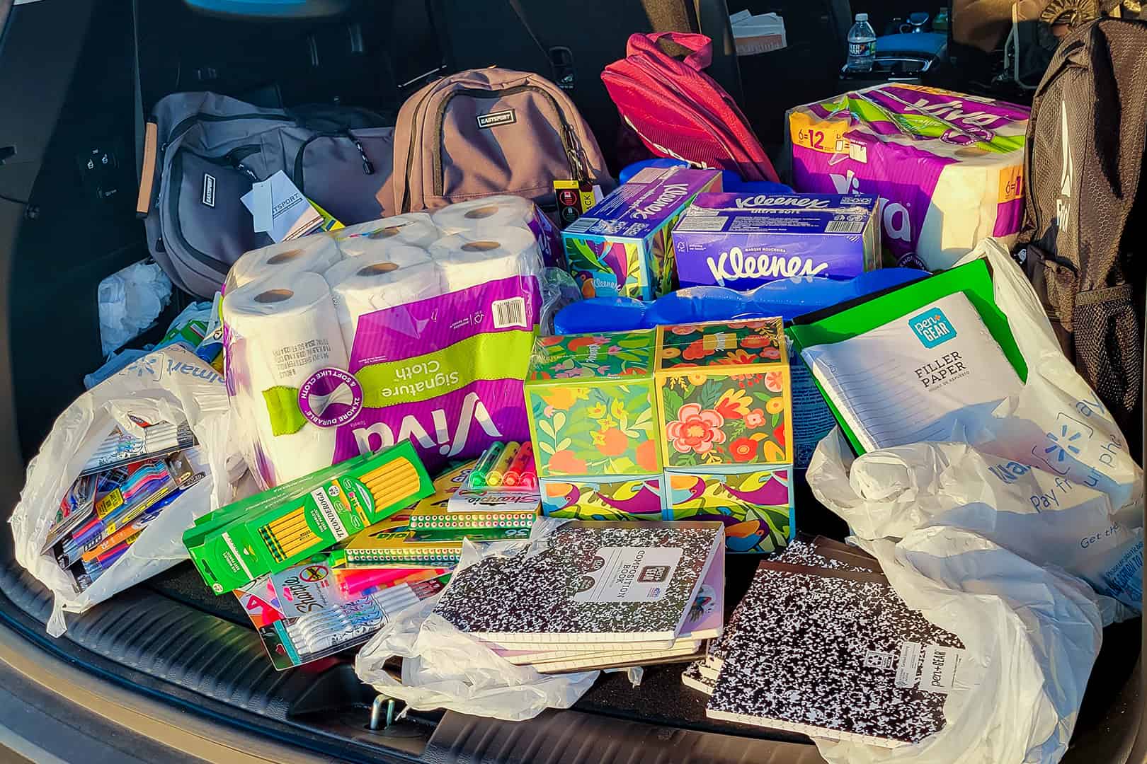 Paper towels, tissues, composition books, and other donate school supplies in the back of a car