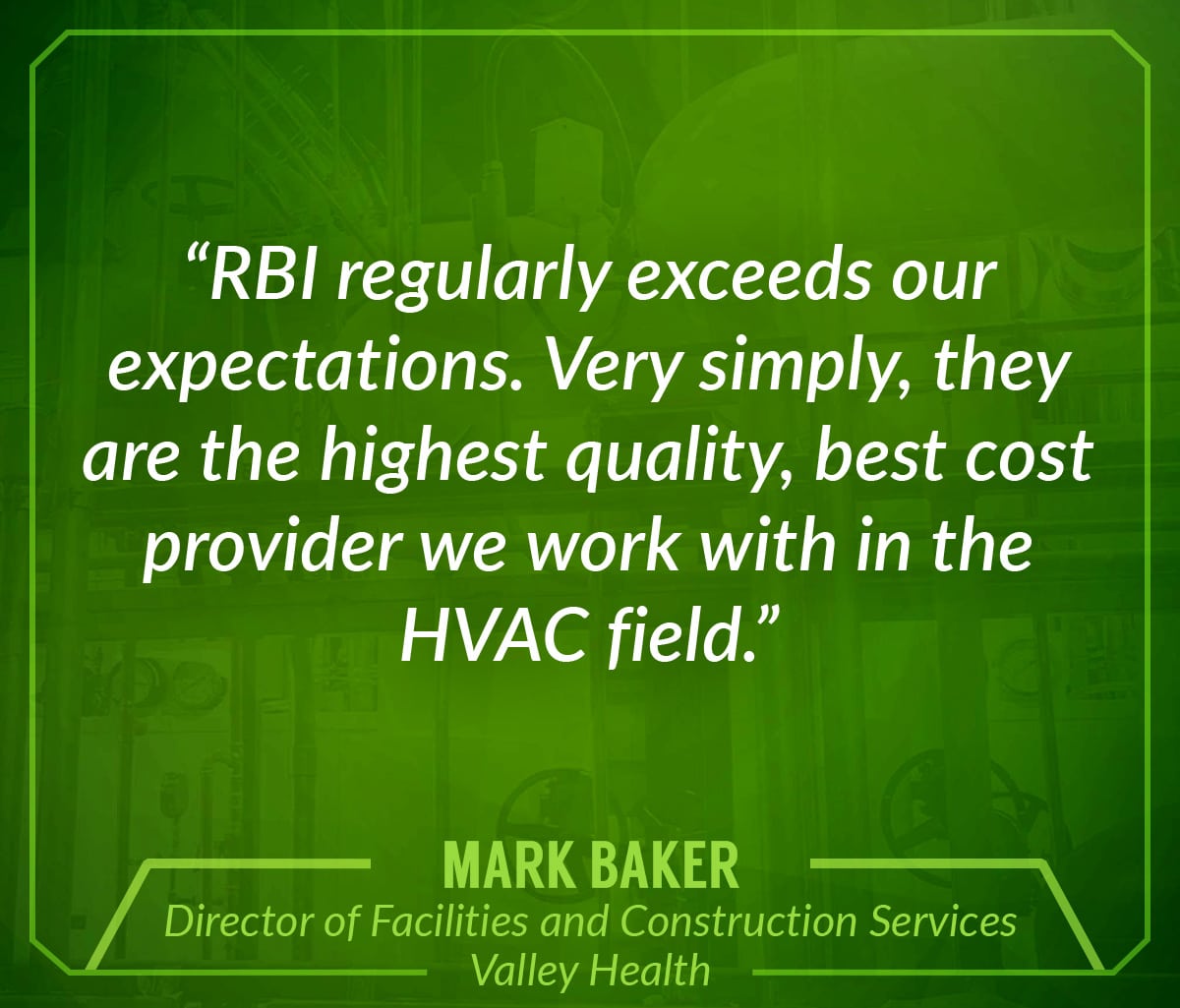 "RBI regularly exceeds our expectations. Very simply, they are the highest quality, best cost provider we work with in the HVAC field." Mark Baker, Director of Facilities and Construction Services, Valley Health