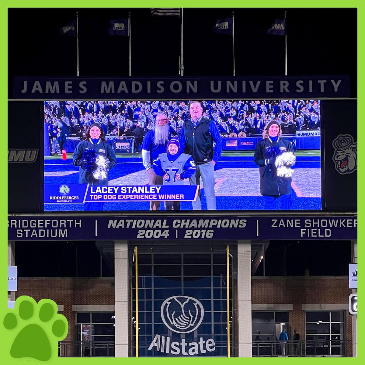 RBI Top Dog, Lacey, on the big screen at the JMU field